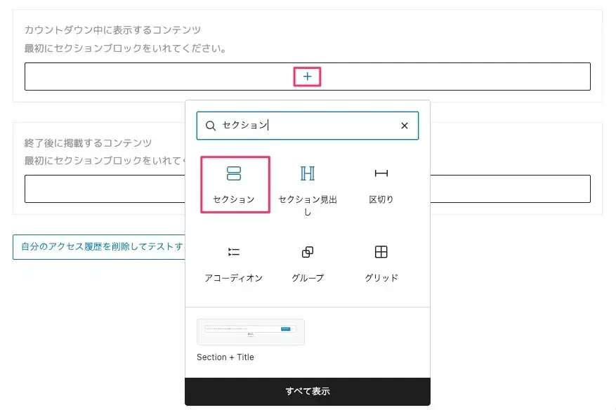 +ボタンを押して、セクションブロックを入れて下さい。