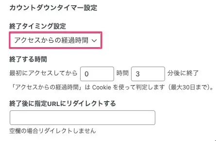 編集画面下のカウントダウンタイマー設定では、終了タイミングを「アクセスからの経過時間」と「指定の日時」の2つから選択することができます。