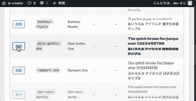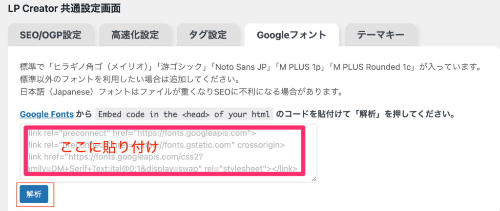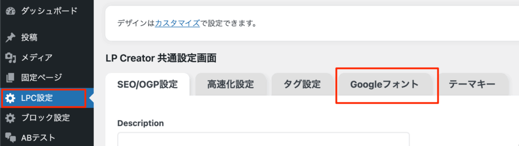 左メニューの「LPC設定」から「Googleフォント」タブをクリックします。
