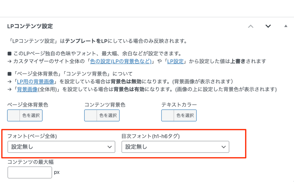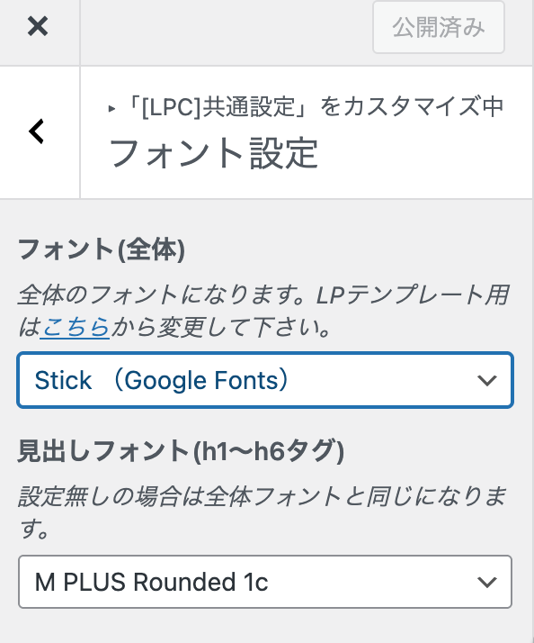 赤色が囲われた「[LPC]共通設定」はサイト全体の設定になります。(どのテンプレートでも同じフォントになります)