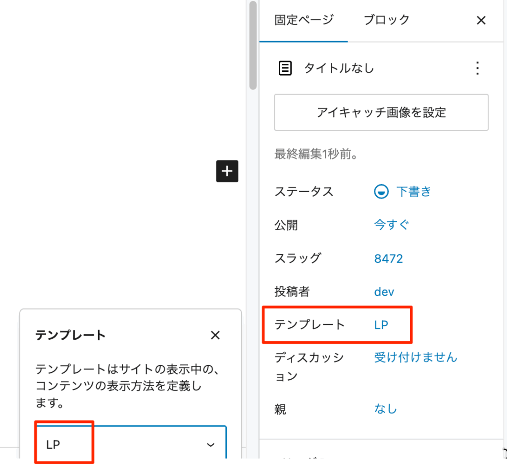 まずは右パネルからテンプレートを「LP」に設定します。(デフォルトテンプレートをLPにしている場合はデフォルトテンプレートでも可能です。)