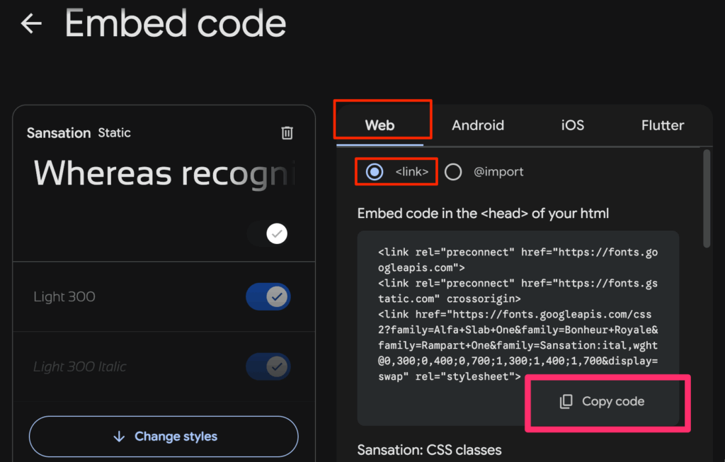 Google Fonts から追加したいフォントを選んで、 Embed code in the <head> of your html の「Copy code」を押してコピーします。