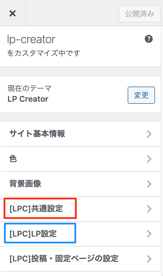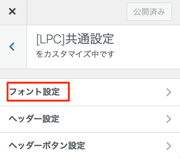 固定ページ(LP)の設定 > カスタマイザーの「LP設定」> カスタマイザーの「共通設定」
