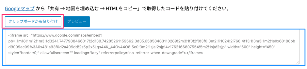 下記が表示されますので、赤枠の「クリップボードから貼り付け」を押すか、もしくは、青枠の箇所にタグをペーストします。