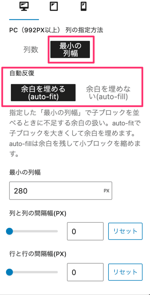 指定した「最小の列幅」で子ブロックを並べるときに不足する余白の扱いです。
