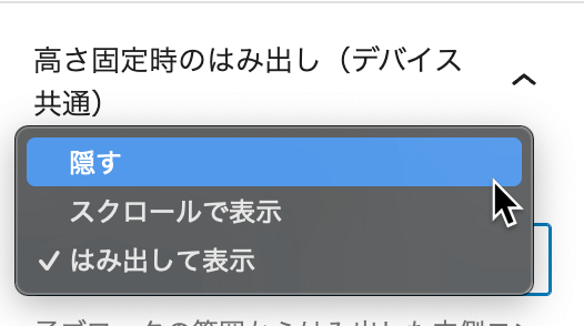 「高さ固定時のはみ出し」は、指定した行幅以上に中身のコンテンツがあった場合、「隠す」「スクロール」「はみ出す」の挙動が設定できます。