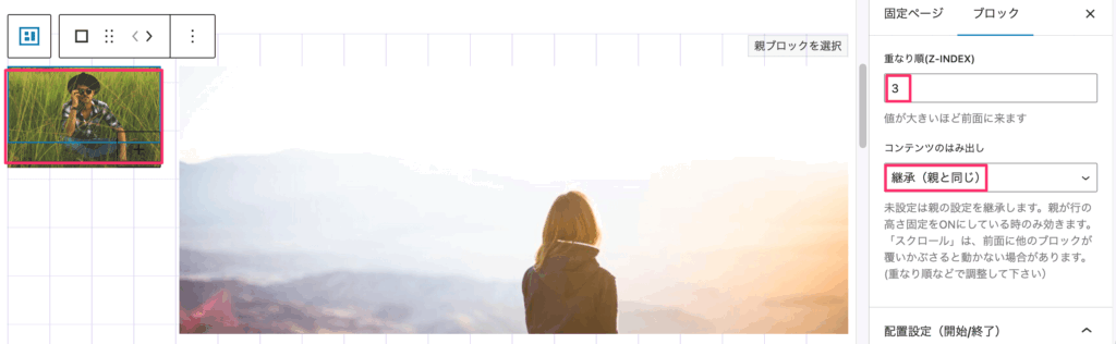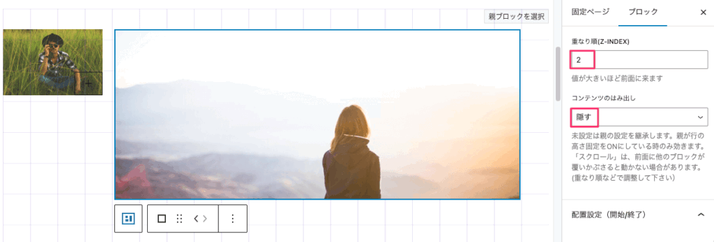 次に左側の画像は重なり順を「3」コンテンツのはみ出しを「継承(親と同じ)」にしています。