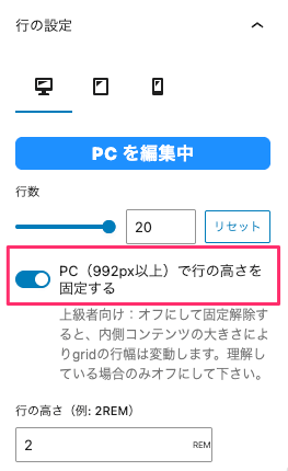列の設定の「グリッドの列数を変えない」をオフにすると、各デバイスに応じて列数を変更することができます。
