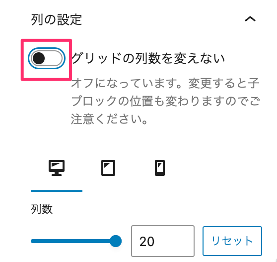 列の設定の「グリッドの列数を変えない」をオフにすると、各デバイスに応じて列数を変更することができます。