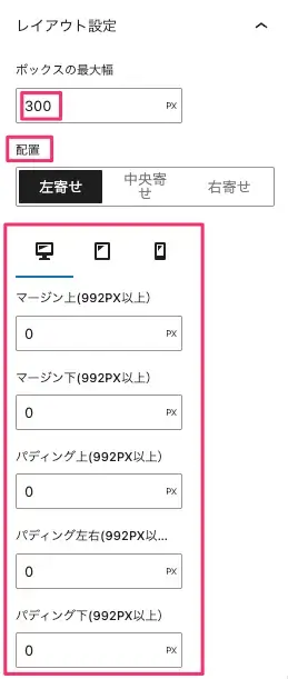 ボックスブロックのスタイルから、「最大幅」を300px等に固定設定します。