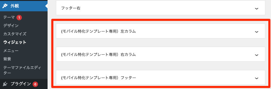 「外観」→「ウィジェット」から下にスクロールすると、(モバイル特化テンプレート専用)のウィジェットがあります。