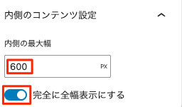 上手くいかない場合は、セクションブロックを入れて「背景の幅」を「全幅」や、「内部コンテンツ」の最大幅を「600以下」px 、「完全に全幅表示にする」などにチェックを入れるときれいに収まります。