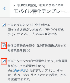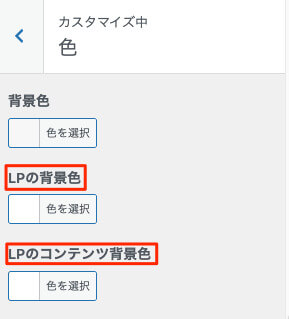 まずは「外観」→「カスタマイズ」より、「色」にすすんで、「LPの背景色」と「LPのコンテンツ背景色」で色を選択します。