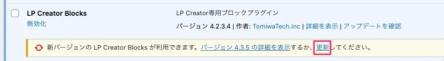 アップデートがある場合は、以下のように「新バージョンの〇〇〇が利用できます」と表示されますので、「更新」のリンクをクリックして下さい。