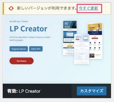 「外観」→「テーマ」から対象のテーマにアップデートがある場合は「今すぐ更新」と表示されていますので、そのリンクをクリックして下さい。